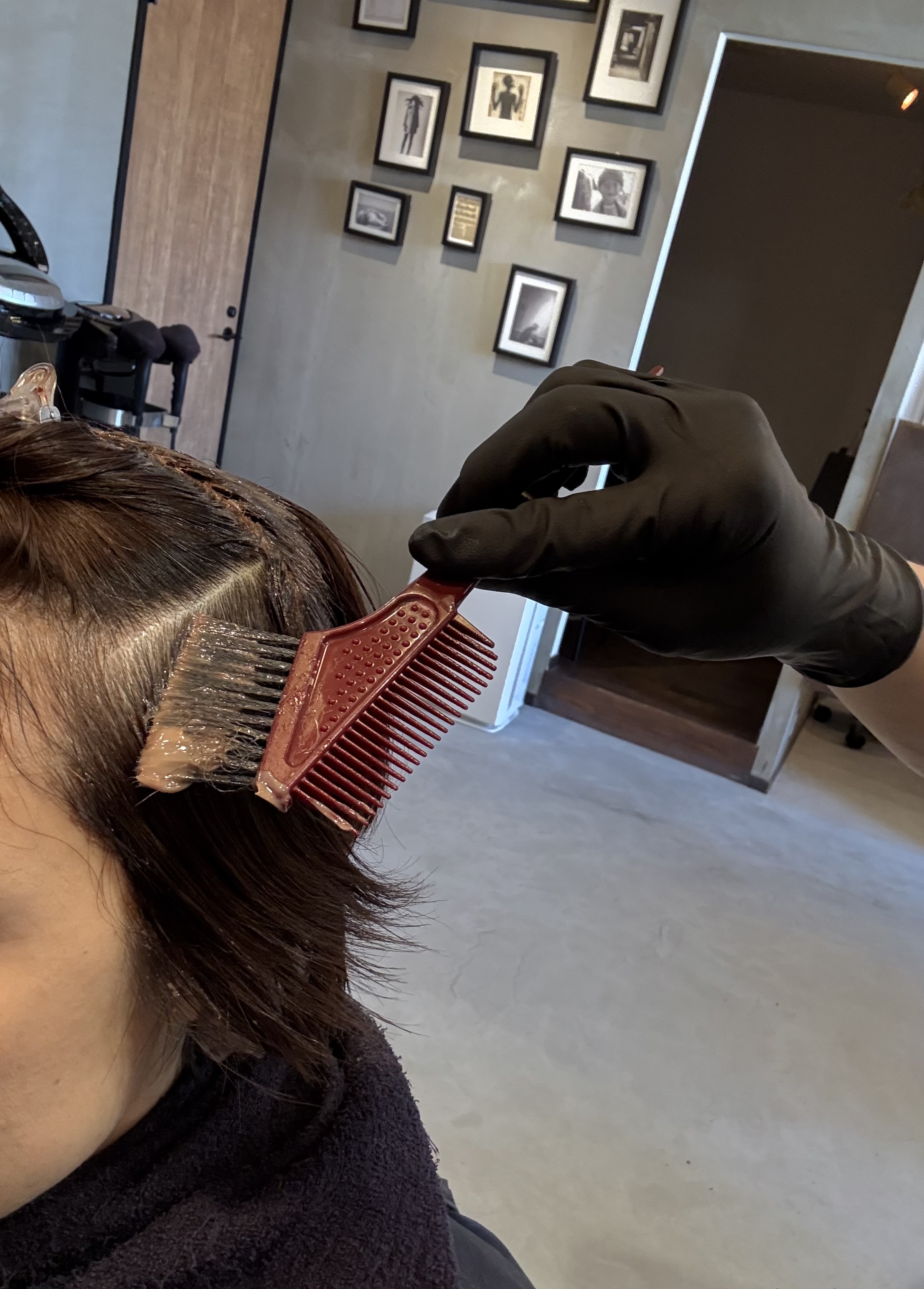 白髪率が足りない場合に全体を白髪と同じくらいの均一なバランスになるようにブリーチで細かいハイライトを入れて明るいベースを増やし、その後、グレー、ベージュ系のカラーを入れてなじませます。(これは白髪染めではないので白髪は薄染まり程度)