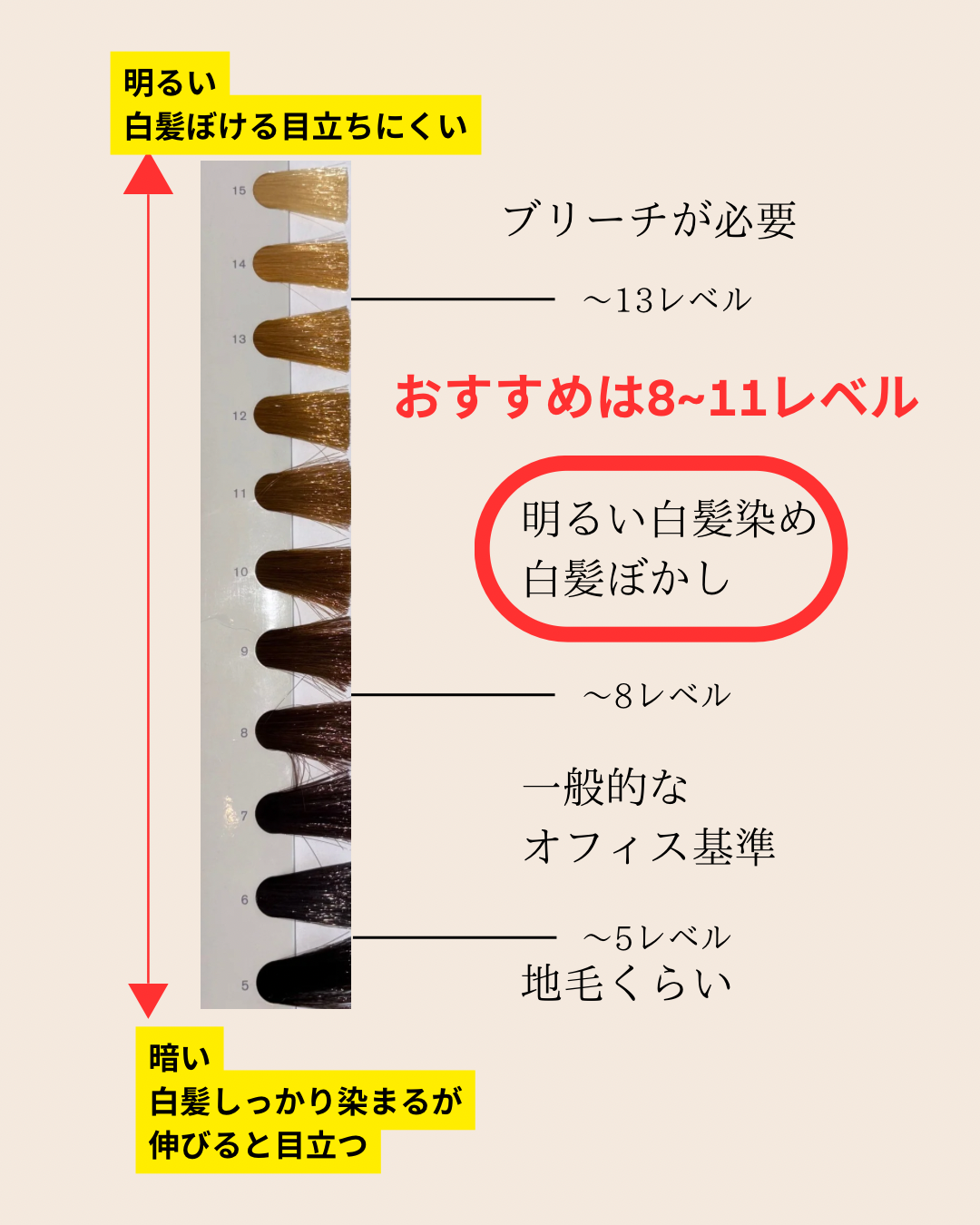 A: 白髪を受け入れるか、受け入れないか?やりたい明るさで選んでいいと思います。